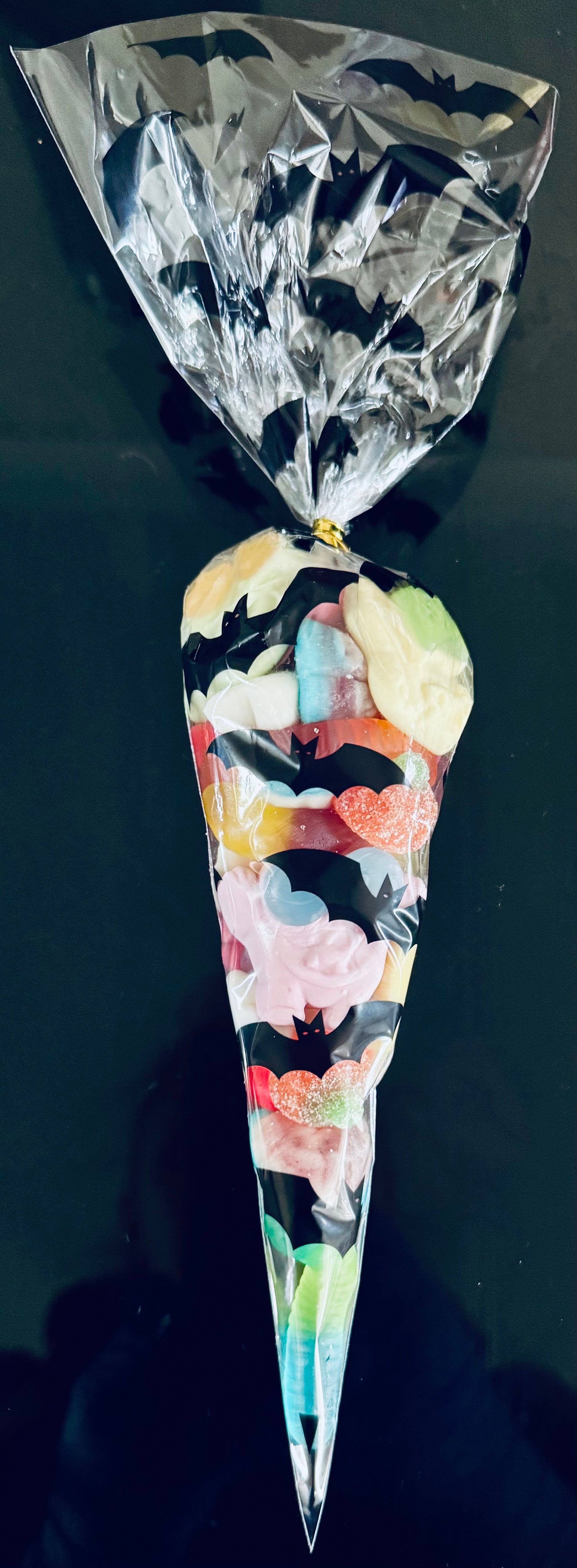 Bat cones filled with Halloween sweets. Monsters, gummy bones, snakes, chicken feet, gummy pumpkins, jelly filled brain, witches faces and Dracula teeth. 100g in each cone great for Halloween parties ☺️🍭🍬